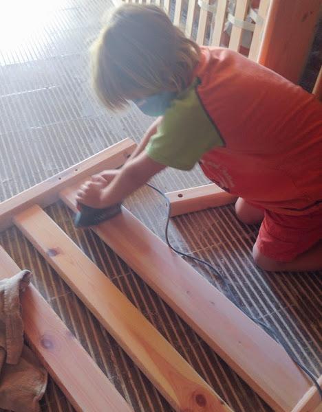 a) Lo lijas del todo y lo tratas como a un mueble en crudo. Esta opción solo es aplicable a los muebles de madera maciza. Si tu mueble es de contrachapado y melamina puedes destrozarlo lijando. Si usas esta opción, lija tu mueble a conciencia, como hicimos nosotros con las camas del pompón friki y el pompón peque y luego trata el mueble como si fuera un mueble en crudo.