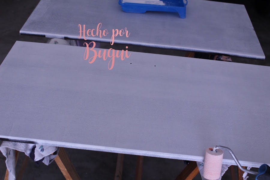 En la imagen se ve la pintura gris aplicada a brochazos y encima se aplica la beige con una capa fina para dejar entrever la oscura.