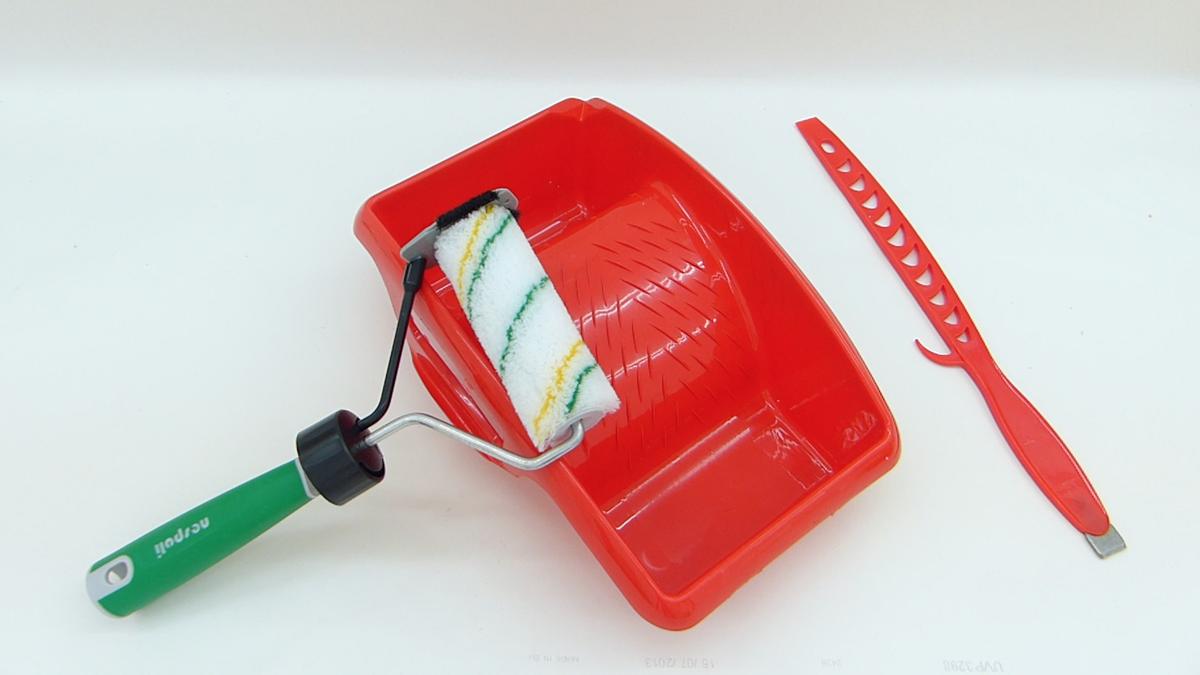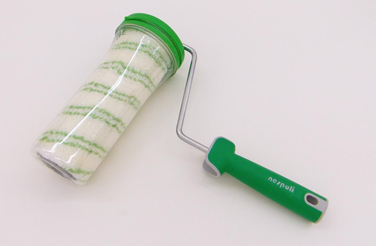 Voy a utilizar este rodillo que tiene un bote integrado para cuando terminemos de pintar con él poder guardarlo sin que se seque el rodillo. Se engancha al alargador tan solo con un movimiento y ya está listo para usar.