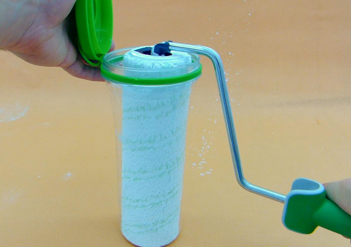 Luego, gracias al sistema de RollMatic solo tengo que meter el rodillo en el bote, presionar hacia adentro para que se libere la parte del rodillo de la del mango y ya lo puedo dejar ahí guardándose hasta 3 semanas sin secarse. Es una manera muy rápida para sustituir el recambio por otro rodillo y continuar con la siguiente tarea.