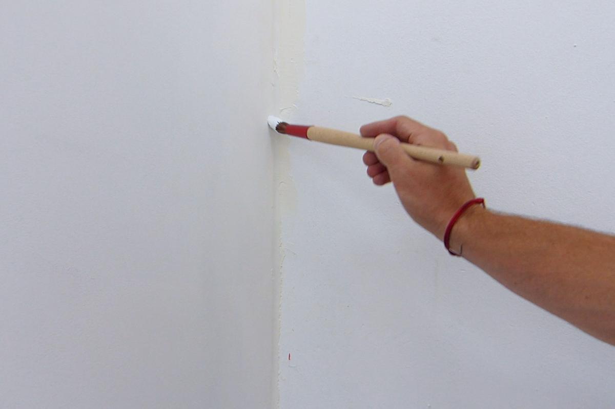 Esta vez, con una cubeta de mano y un pincel voy a ir aplicando la pintura en todas las esquinas. Hacemos movimientos verticales con el pincel a lo largo del encuentro entre el tabique y la pared por los dos lados de este.