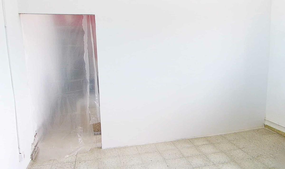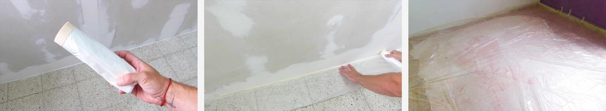 Con el fin de proteger el suelo y las superficies delicadas vamos a poner un plástico protector de esta manera por el suelo. En mi caso no tengo demasiados partes a cubrir ya que no tengo ni puerta todavía pero tu encinta y protege cualquier zona que no quieras manchar. También he puesto plástico cubretodo por el suelo de una habitación donde se va a pintar el techo.