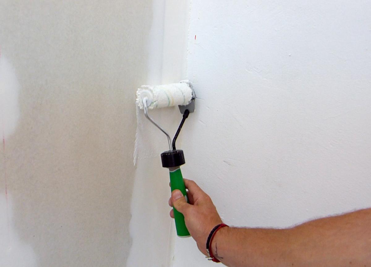 Tras verter un poco de pintura en la cubeta comenzamos pintando por las esquinas. Este rodillo con su escobilla ira pintando toda la esquina sin necesidad de tener que haberlo hecho previamente con una brocha o pincel. Después desactivo la escobilla y continuo pintando el tabique de manera normal. Voy a aplicarle una capa de imprimación y lo voy a hacer moviendo el rodillo en todas direcciones para que penetre correctamente la imprimación en los poros del pladur. Con la cubeta de mano se hace más cómodo el trabajo al no tener que estar agachándome cada vez que quiero mojar el rodillo.