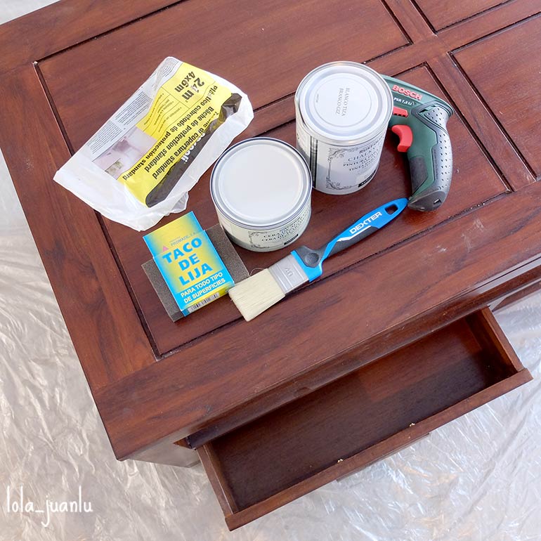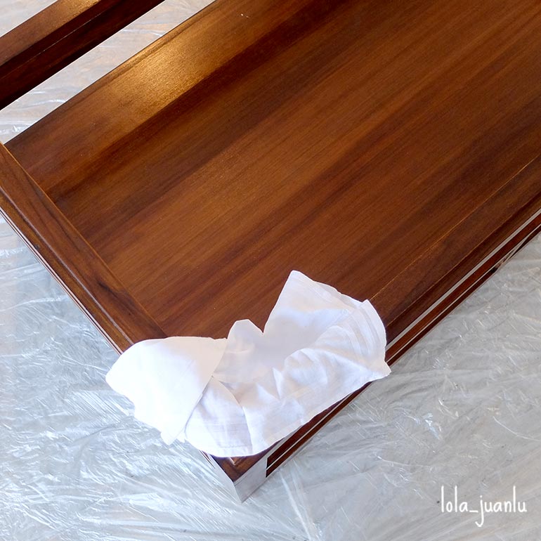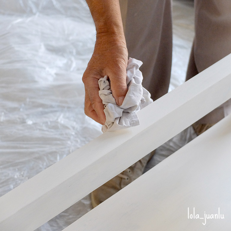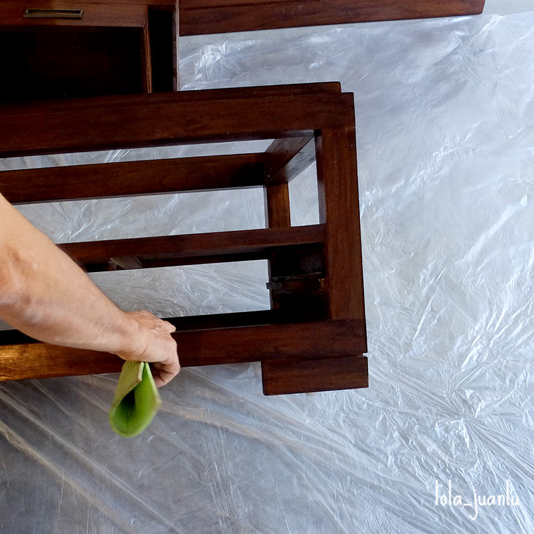 Lijamos la mesa y limpiamos con una bayeta húmeda. Secamos bien con un trapo (que no deje pelusa) para que quede limpia antes de aplicarle la primera capa de pintura.