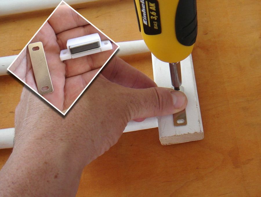 Para el cierre hemos escogido la pletina magnética que suele ponerse en los armaritos de baño. Es muy barato y sencillo de montar, lo encontraremos también en nuestra ferretería. Este imán es pequeño, pero ejerce bastante tracción.