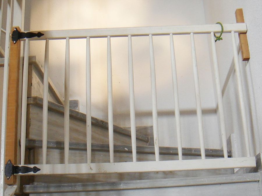 ¡Ya tenemos la barandilla colocada! El 'pestillo' es una cuerda elástica que se engancha en un cáncamo, para prevenir la posibilidad nada remota de que la insistencia de Coco acabe triunfando ante el imán.