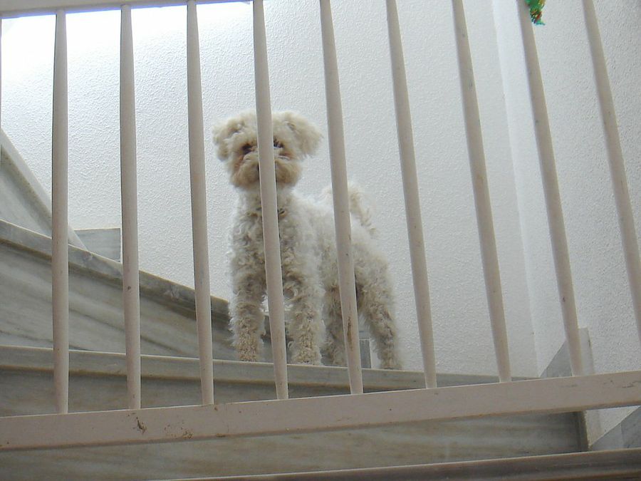 He aquí el motivo de necesitar una barandilla en la escalera. Se llama Coco y su mayor afición es bajarse al sótano, ocupado por un taller de moda, para revolver y mordisquear todo lo que encuentra allí: cintas, bobinas de hilo, sombreros, flores de tela...