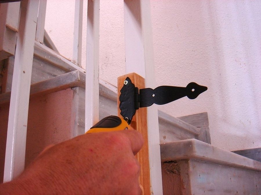Una vez ha secado el adhesivo de montaje, proseguimos poniendo las bisagras. En la ferretería compramos dos bisagras de pala, el tipo que conviene a una hoja más ancha que alta, aunque sea ligera. Hemos medido la anchura del listón horizontal de la barandilla, para escoger la bisagra más grande que se pueda colocar.