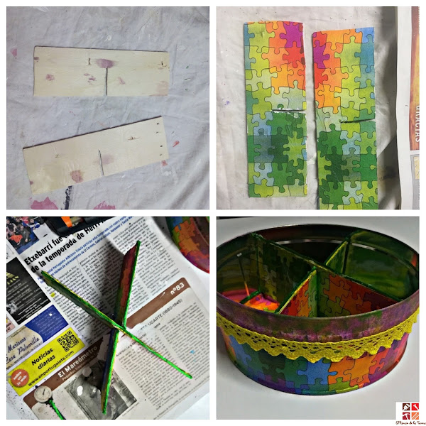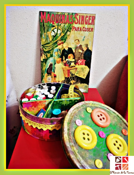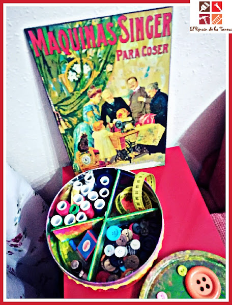 Cuando me puse con ella, tenía una idea clara, algo muy vintage, porque siempre se me va la inspiración para decorar con este estilo, pero... ya había hecho en su día dos costureros muy de este estilo, aquí os pongo el enlace por si deseáis recordarlo: Latas decoradas