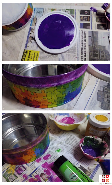 Para la base (parte de abajo) de la lata, lo mismo, pinté de rosa fuerte y con la esponja toques en morados, amarillos , verdes. etc.