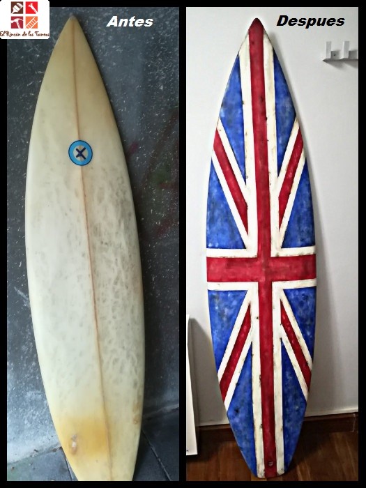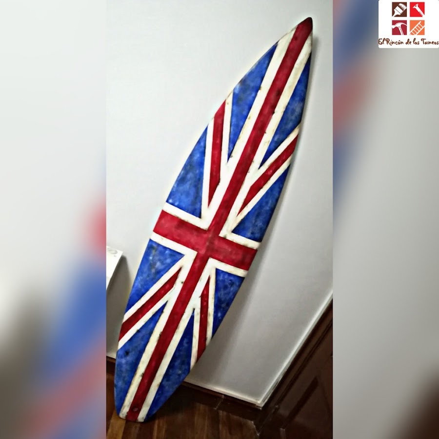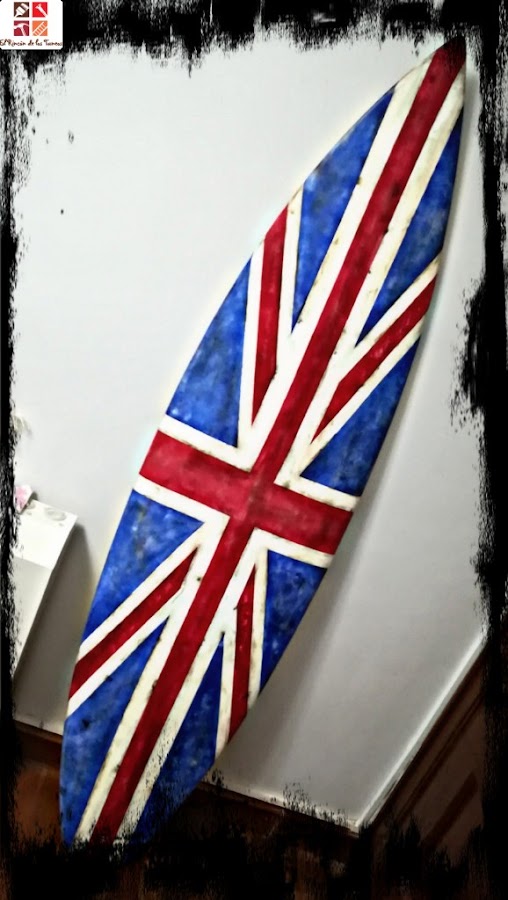 Jose se puso en contacto conmigo a través de internet donde vio mis trabajos, quería que le tunease su tabla de surf para decorar una pared de su casa y se la pintase toda ella con la bandera inglesa y como única condición: la tratara como si la hubiesen pasado tres coches por encima de ella.