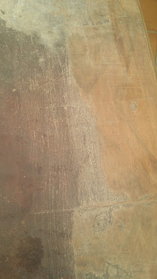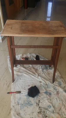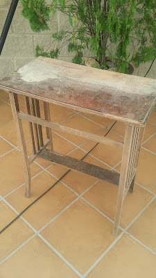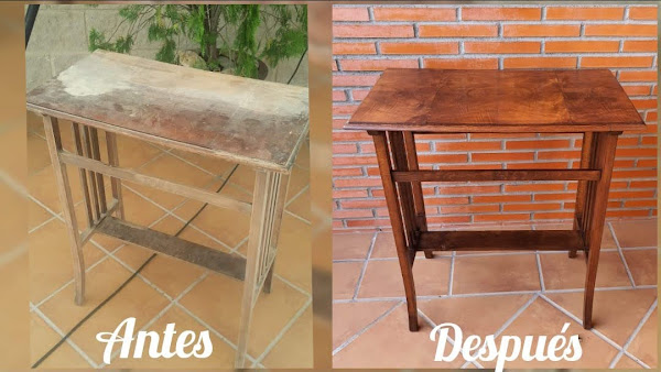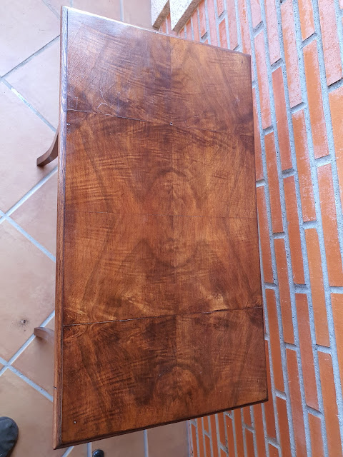 Una vez la mesa está limpia y bien lijada, la doy una ligera mano de nogalina, para igualar tono entre el sobre y las patas.