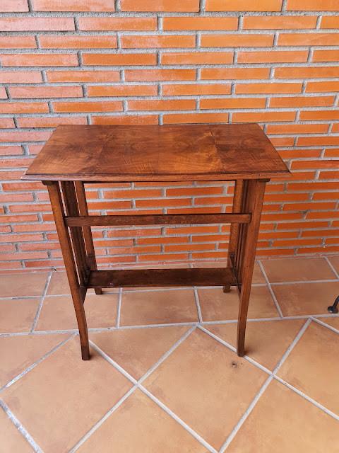 Se trata de una mesita auxiliar de líneas muy rectas, creo entraría en los muebles de estilo art deco típica de los años 50.