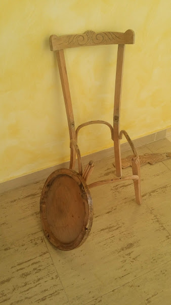 Una vez retiro el barniz raspando, procedo a desmotar la sillas para lijar minuciosamente cada pieza que la componen, de tal manera que la madera queda con un suave tacto.