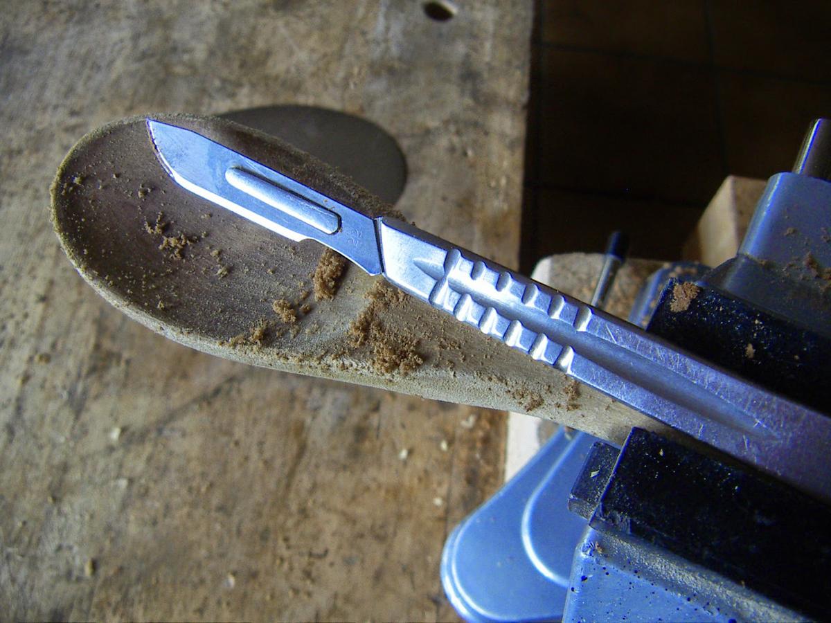 Raspamos bien con la cuchilla hasta dejar l superficie plana siempre siguiendo las formas de la pieza