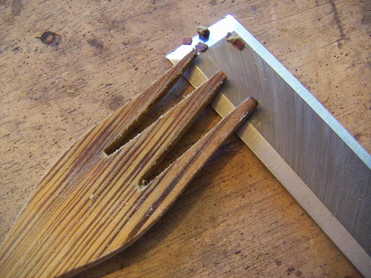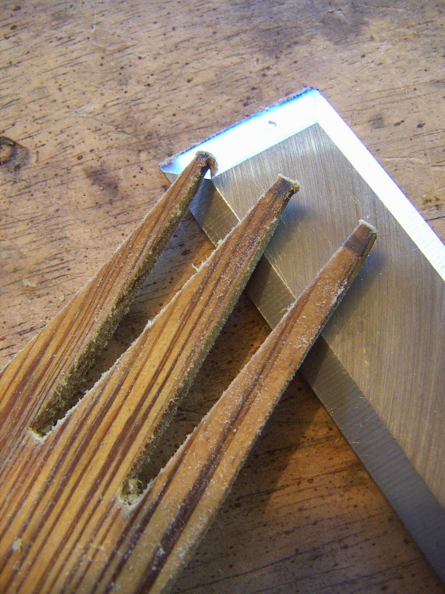 Trazamos una línea en el borde más o menos en ángulo recto y recortamos la madera por la línea.