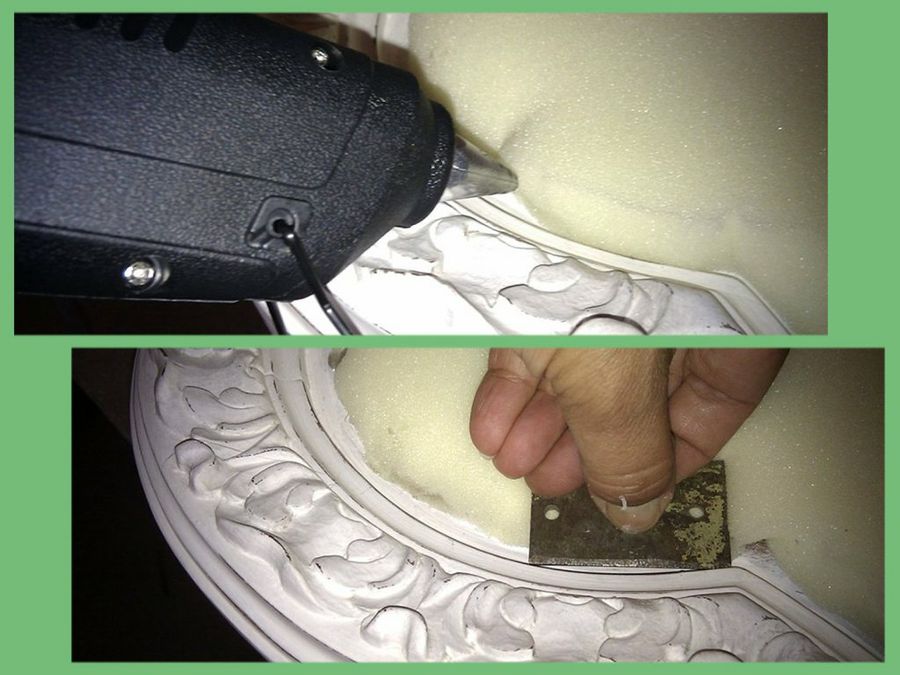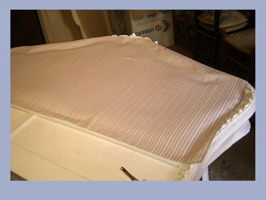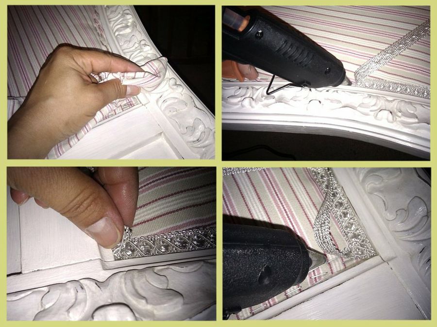 "En este espacio sin espuma", aclara nuestra amiga, "después se grapa la tela y se coloca un galón. La zona superior del canto de la goma espuma queda pegada a la madera y la inferior escondida hacia dentro, así no quedan irregularidades. Hay que presionar durante unos segundos la zona, yo utilicé una chapa vieja para no quemarme los dedos porque la cola sale ardiendo".