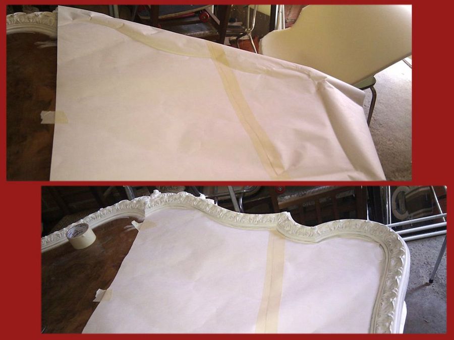 "Uní dos trozos de papel pintado antiguo que tenía por casa, lo puse encima del cabecero y con los dedos fui apretando con cuidado para marcar el borde de todo el cabecero y sacar una media plantilla. Después de pasar los dedos por todo el borde queda así y ya se puede recortar".