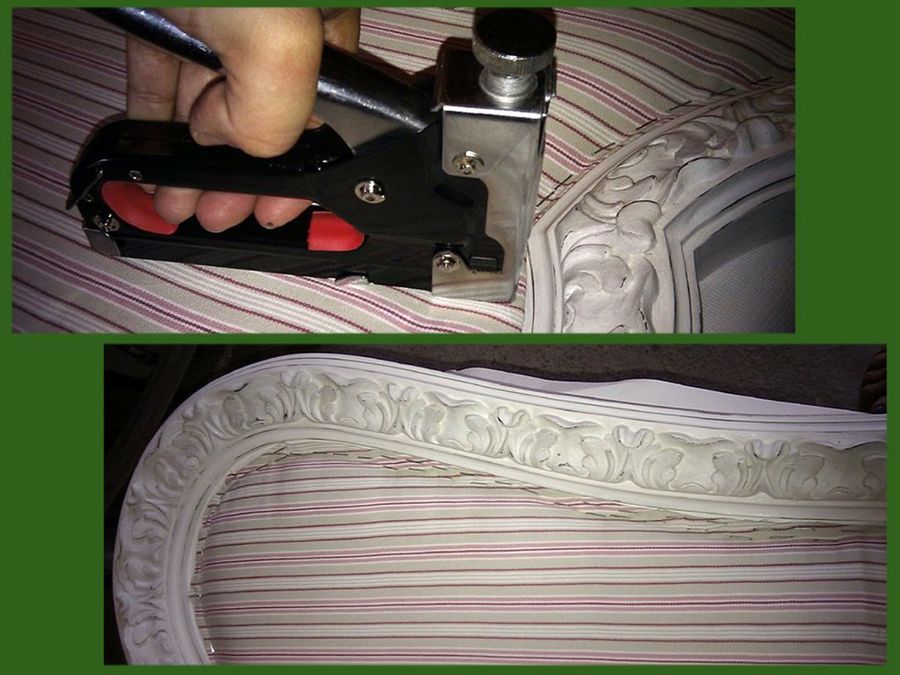 "Empecé a grapar la tela por el centro en la parte inferior y tensé para grapar en la parte superior. Al tener rayas hay que tener cuidado al estirar y grapar para que no se tuerzan. Después fui grapando todo el contorno, es un trabajo bastante sencillo, sólo hay que tener en cuenta que la tela no quede floja y que no se tuerza el dibujo".
