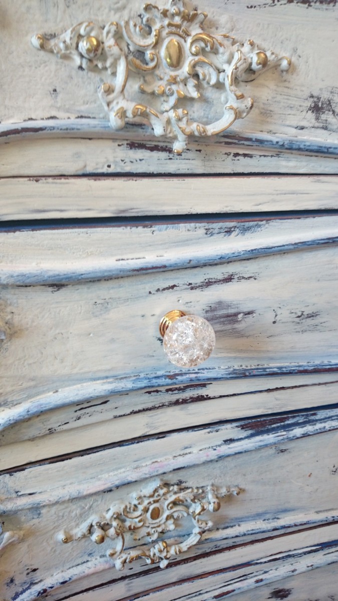 8º Y como detalle cambié los tiradores que estaban estropeados por otros modernos en cristal y dorado que le ponían el toque final. Y aquí puedes ver el resultado.