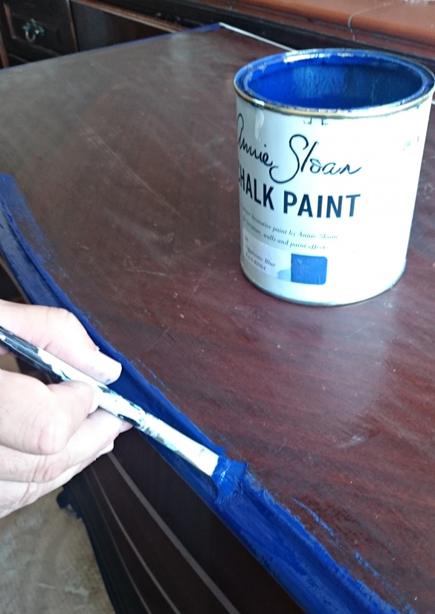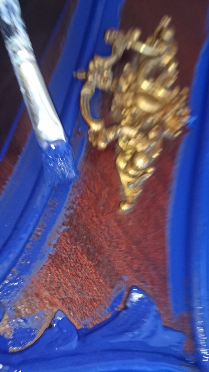2º Pinté de azul los bordes y las molduras. Sin prestar atención a perfilar pues mi idea era salirme un poco para que cuando diera el tono blanco se fundieran un poco los colores para que quedara con textura el acabado.