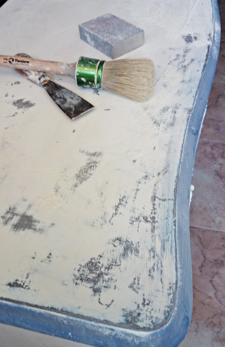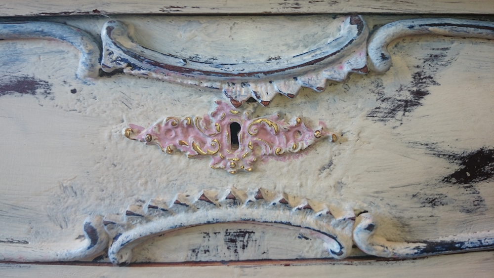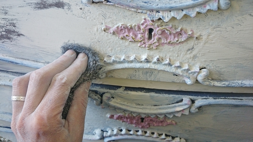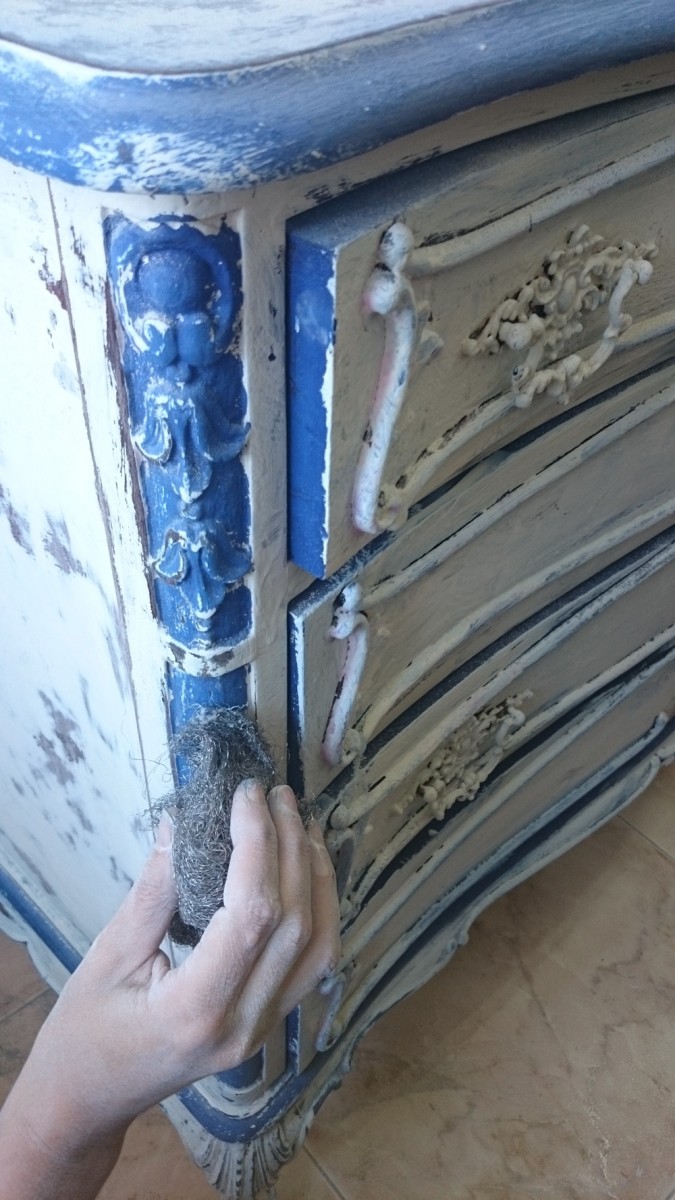 6º Procedí a decapar con la espatula las superficies lisas para que diera la sensación de desconchón y después lije suavemente con la lana de acero todo, incidiendo en las molduras y los tiradores.
