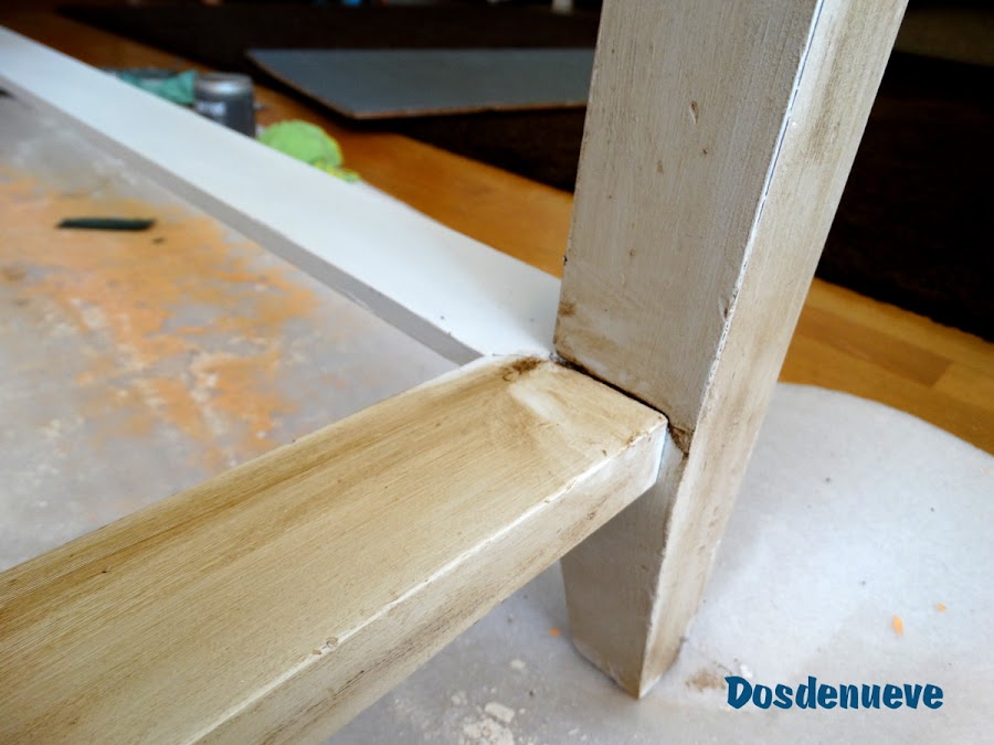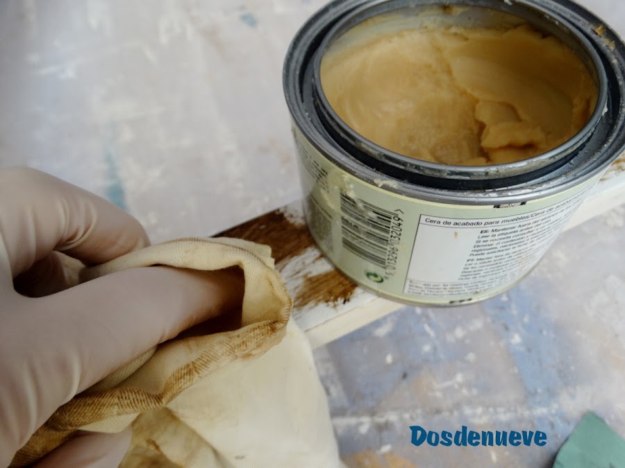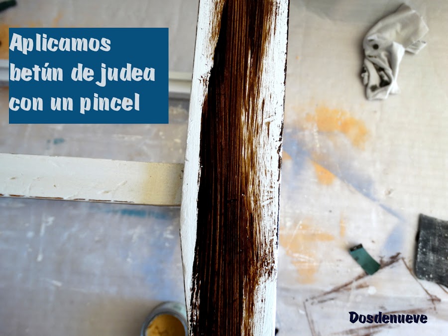 PASO 6: Aplicamos con un pincel betún de judea por toda la superficie. Lo hacemos por partes y de manera irregular. Luego, con ayuda de un trapo untado en cera de acabado de muebles, vamos "repartiendo" el betún de judea de forma más uniforme, a la vez que retiramos el exceso hasta conseguir una pátina a nuestro gusto.