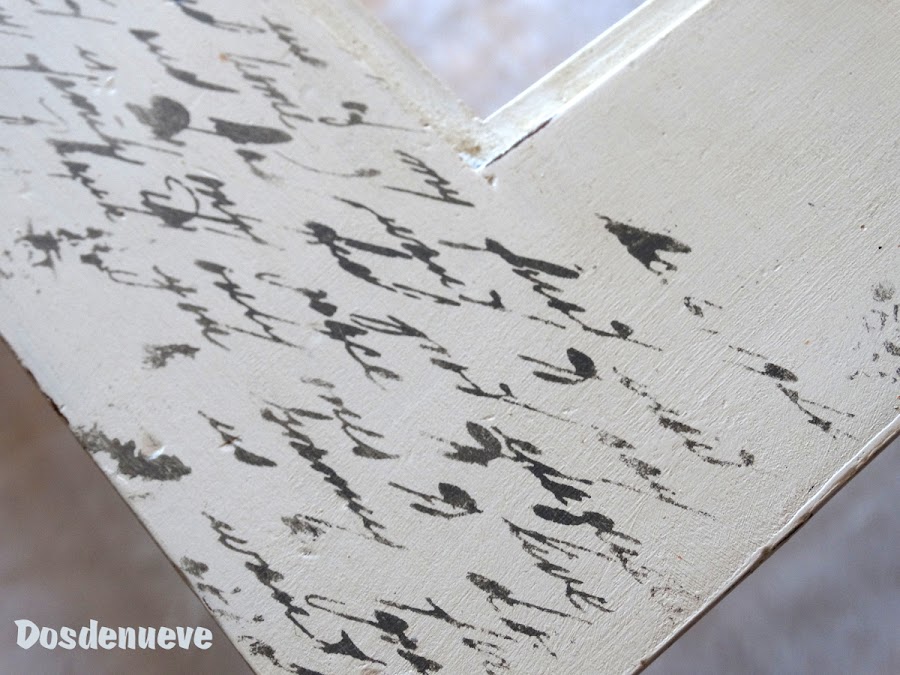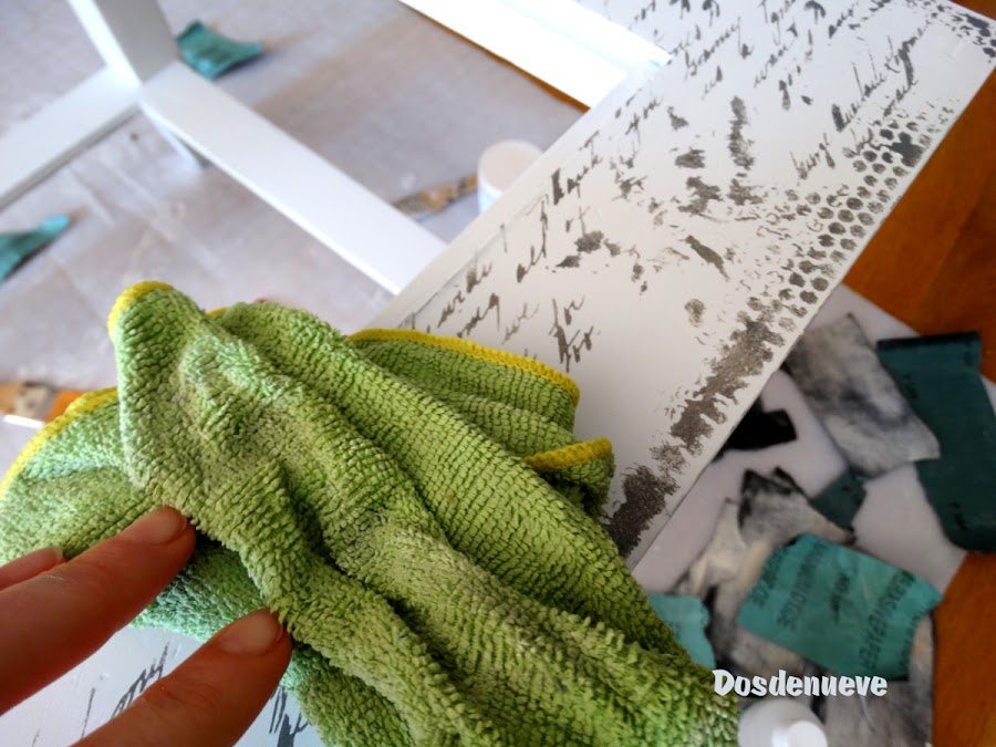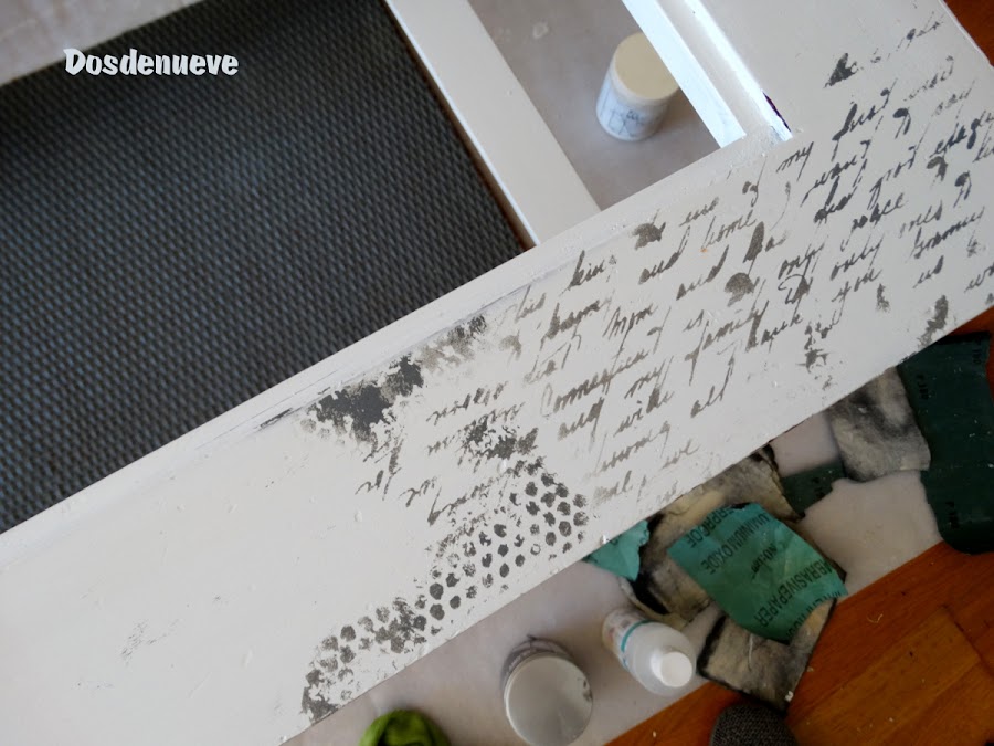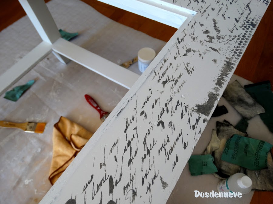 PASO 8: ya tenemos terminada la decoración del sobre de nuestra mesa de centro y, es ahora, cuando aplicamos la pátina de cera y betún de judea.