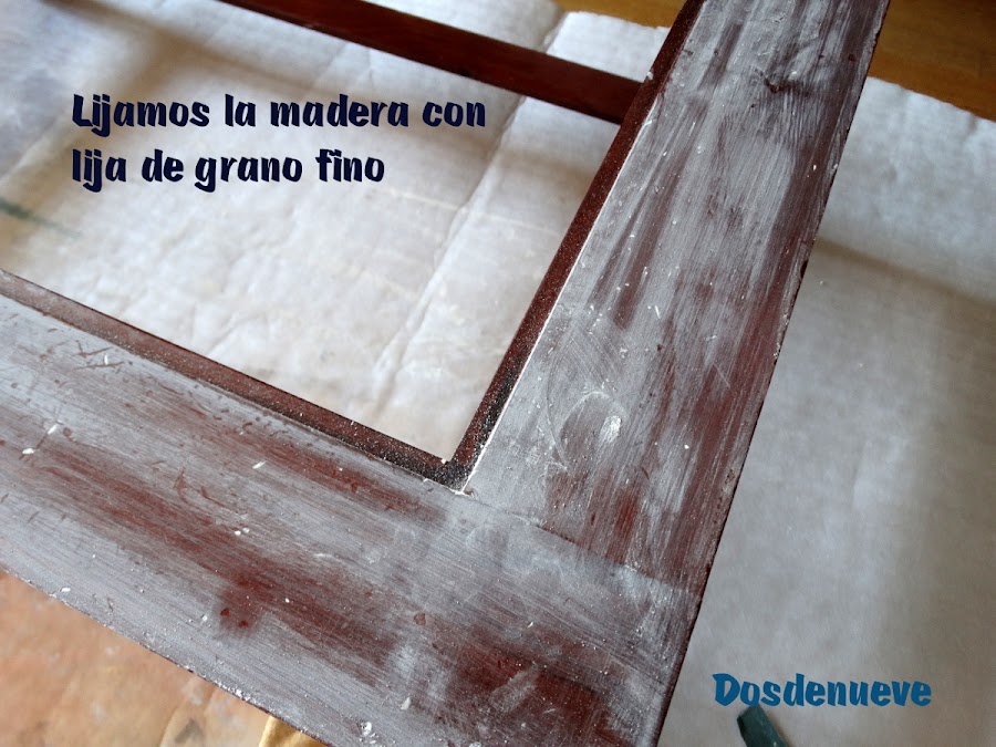 PASO 1: Lijamos la madera con una lija de grano fino. No hace falta que insistamos mucho porque la pintura a la tiza agarra perfectamente sin necesitad de preparar la superficie.