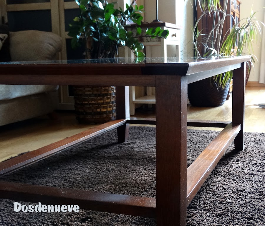 La mesa de centro era una mesa de cerezo, con un barniz rojizo que ya no nos gustaba. Además, presentaba varios arañazos producidos por el uso y el panel de la parte inferior se despegaba continuamente en cuanto ponías algún objeto que pesara un poco. En las esquinas, durante muchos años, estuvieron colocados unos protectores para evitar los golpes y al quitarlos, el adhesivo era tan fuerte, que arrancó parte del barniz.