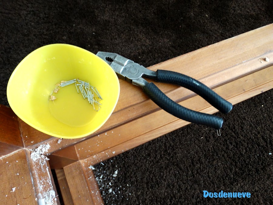 PASO 2: Damos la vuelta a la mesa y retiramos los restos de cola. Como el panel decorativo de la parte inferior se había caído en varias ocasiones lo habíamos pegado con cola de carpintero muchas veces y fijado, además, con puntas.