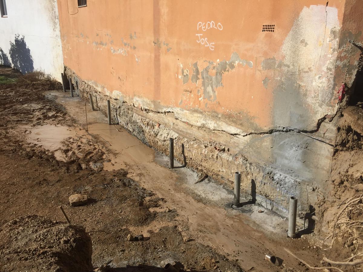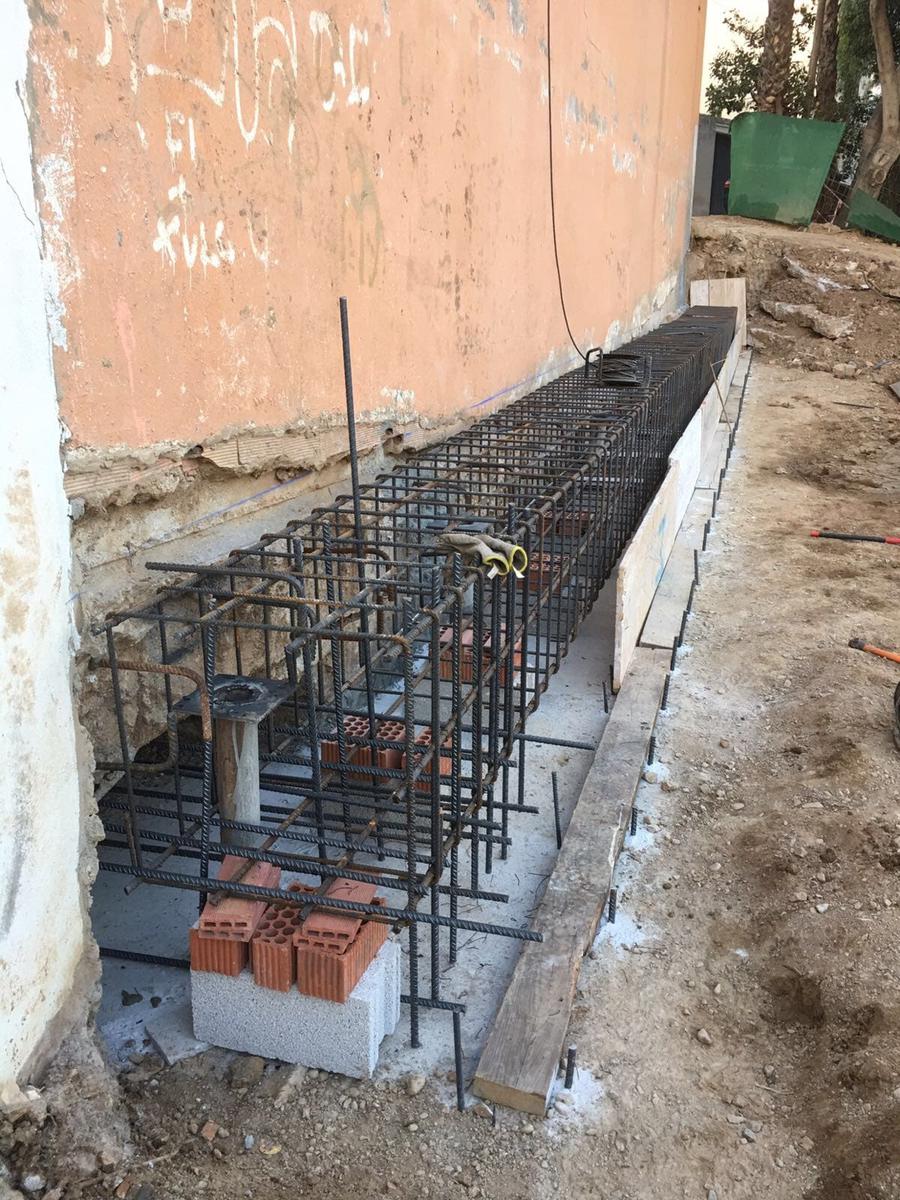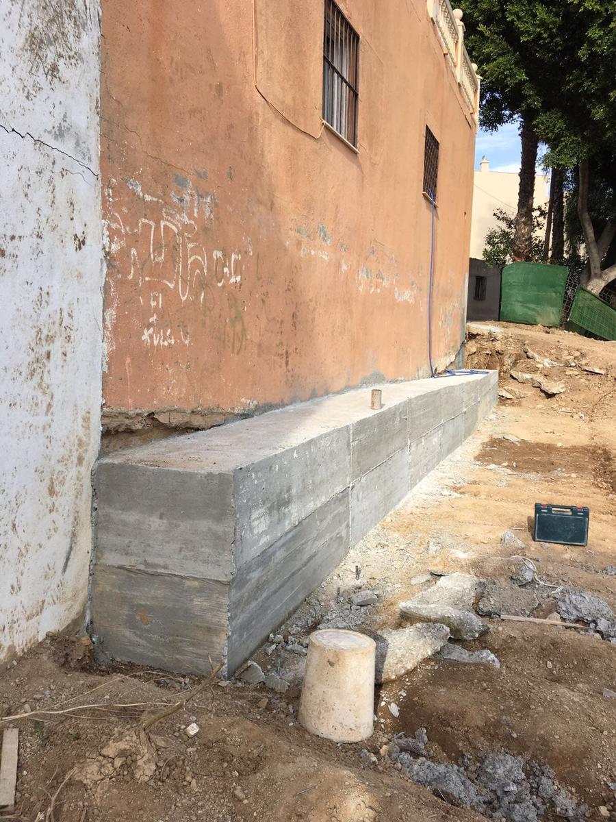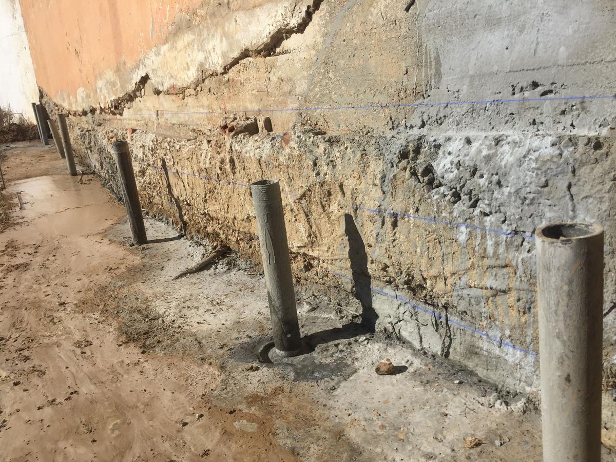 Tras realizar el estudio geotécnico y comprobar que el terreno firme se encontraba más profundo en un sector de la parcela (había sido rellenada para ponerla al mismo nivel), la solución que reparación fue la de micropilotaje. Para ello se “pinchó” el terreno en los puntos donde se encontraban las zapatas superficiales que no se situaban en el verdadero terreno firme, creando estos tubos de hormigón de unos 15 metros de profundidad para anclarse al terreno resistente.