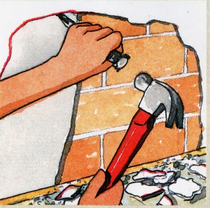 Con un cortafierro y un martillo, pique el revoque húmedo. Puede que se encuentre con una pared también revocada con mezcla gruesa.