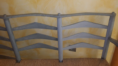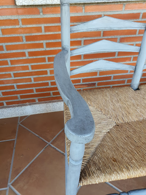 Para el acabado uso una pintura a la tiza, color gris azulado. En esta foto se aprecia una parte con la cera a modo de pátina y la otra solo con la pintura, decir que el color cambia un poco, logrando la cera un juego de luces y sombras.