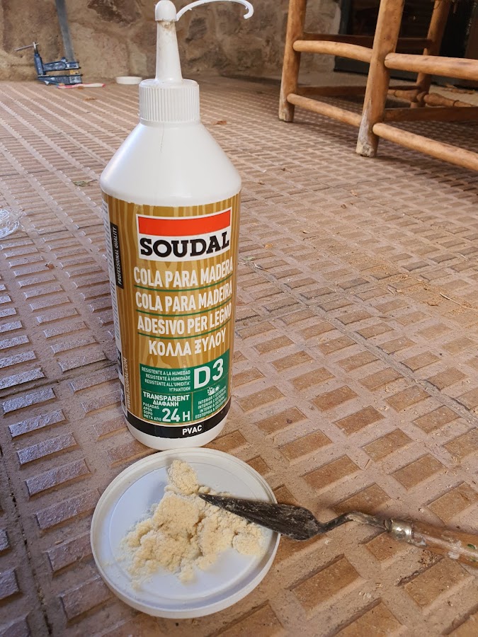 En este caso utilicé la Cola D3 de Soudal para hacer una potente masilla de relleno, aunque esta marca ya tiene preparados comercializados para este fín.