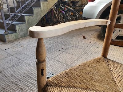 Este es el reposabrazos que repliqué ya colocado en su sitio. El palo del frente sobre el que está el reposabrazos tenía su espiga de madera que va insertada y encolada en lo que es el reposabrazos.