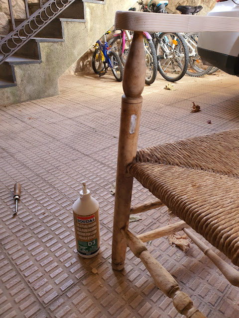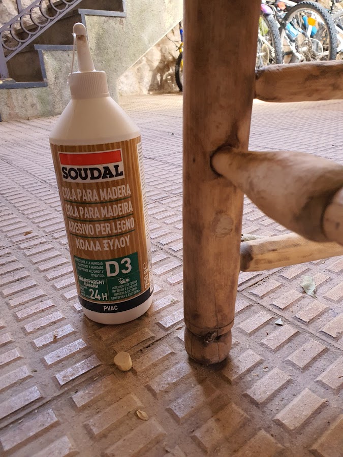 Ven en esta foto una vez metido el trozo de palo redondo en el agujero, lo encolo con la Cola D3 Soudal una vez seco lo lijo y apenas se nota el añadido.