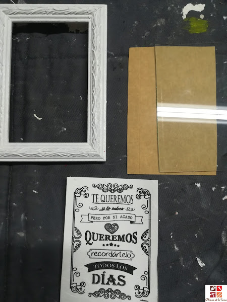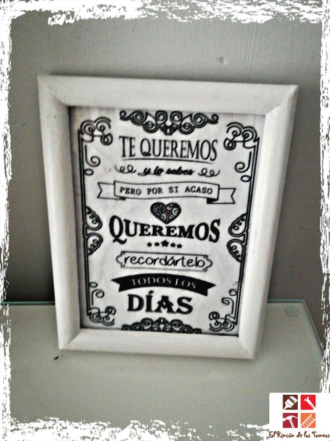 Y entre los varios y diversos cacharros que tenía guardados y pendientes para reciclar son unos portaretratos y marcos viejitos que he "tuneado" en cuadros con mensajes para decorar y también para vender en los mercados, de hecho no tengo ninguno, tuve que hacer varios repetidos porque tuvieron mucho éxito ya que es algo pequeño que decora cualquier rinconcito de casa.