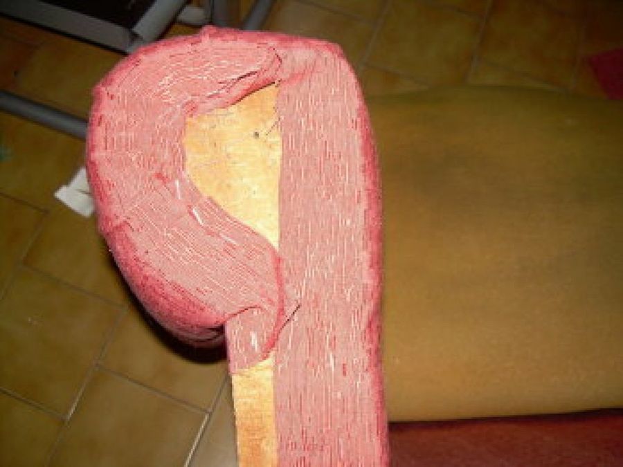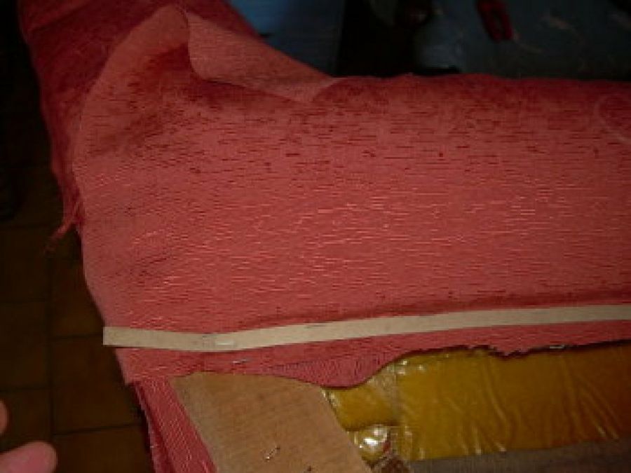En la fotografía podéis ver cómo Adri2010 ha apoyado la tela sobre el brazo, ha grapado por debajo con la tira de cartón, para después dejar caer la tela y grapar por la parte inferior del sillón, por detrás del respaldo y por el frontal, quedando lisa, tensa y con las grapas ocultas (las de la parte frontal se ocultarán con una tablilla).
