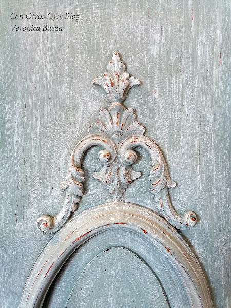 Después de limpiar con alcohol toda la superficie apliqué una mano de chalk paint de color verde grisáceo, una vez seca con una paletina muy poco cargada de pintura fui dando unas pasadas de chalk paint blanco y por último, con una lija de grano fino desgasté algunas zonas para dejar ver el color original de la puerta.