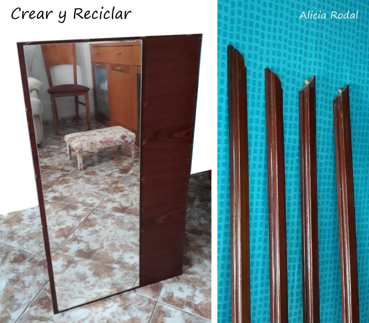 Además del espejo que voy a reutilizar, también voy a provechar, unos embellecedores o listones de madera del mismo mueble. Este mueble viejo era un aparador, con unas puertas muy grandes. Una de las puertas tenía en su interior esta madera grande con un espejo pegado.Desarmamos todo el mueble, para aprovecharlo al máximo, ya que el resto de madera, baldas o repisas, sirven para hacer muchas cosas más. Con una sierra caladora he cortado estas piezas de madera y las usé como repisas para el interior de armarios, estanterías, etc. Tan sólo hay que darle una mano de pintura y listo.