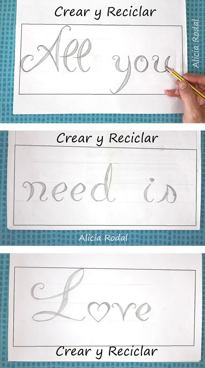 Como yo voy a hacer 3 carteles, debo dividir mi frase entre los tres carteles. Hazlo con lápiz para que puedas borrar y volver a escribir, cuantas veces necesites, hasta que te quede bonito. Recuerda que no tiene que quedar perfecto, eso es lo hermoso de lo hecho a mano.