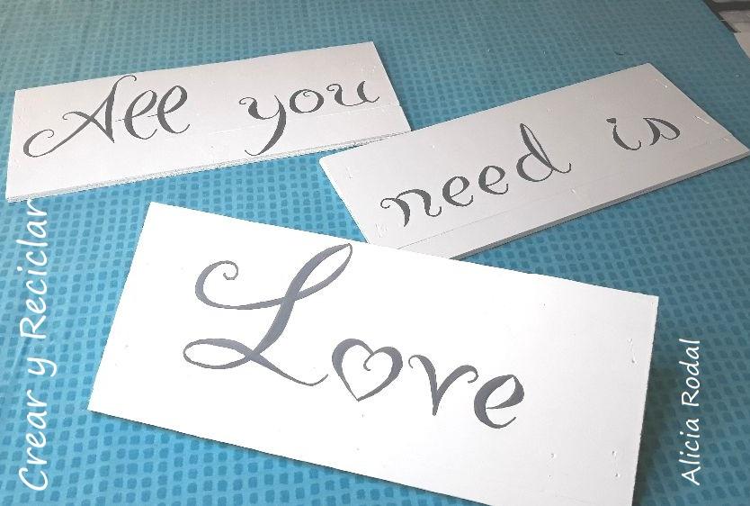 Una vez que hemos escrito los 3 carteles, los dejamos secar muy bien. Si hace falta le damos una segunda mano de pintura, todo depende del tipo de pintura que usaste. Yo le puse una sola mano de pintura, ya que usé pintura para muebles, mezclando la blanca con la negra hasta conseguir un tono gris.