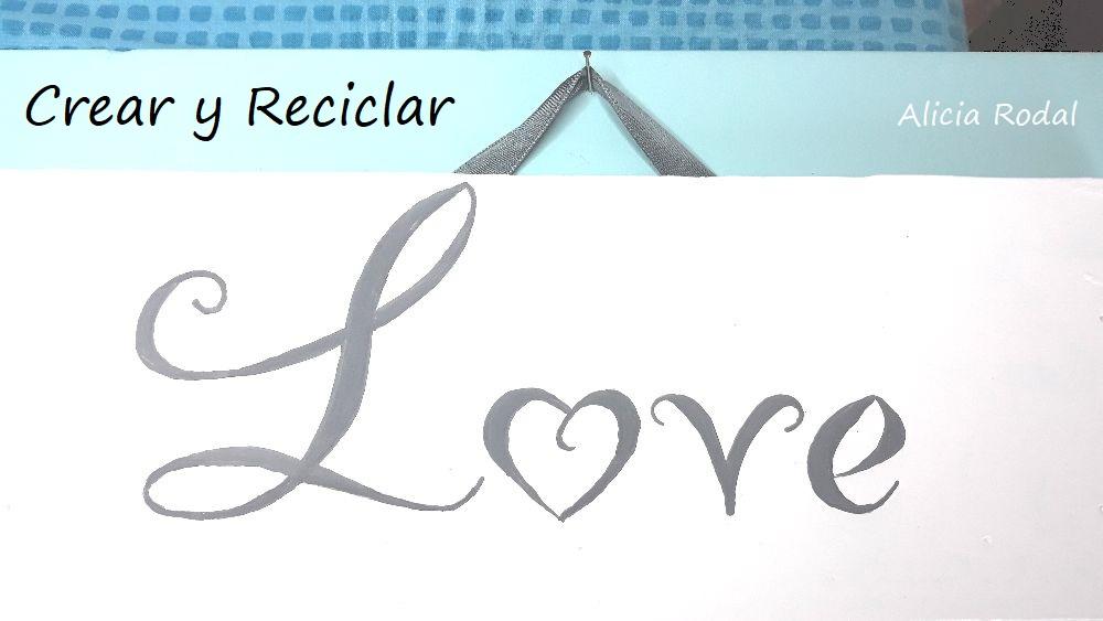 Pones la hoja encima del cartel y con cuidado, escribimos o remarcamos las palabras, de esta forma queda la marca en el cartel de madera. Así será mucho más fácil pintar, rellenar, dibujar las letras, con la técnica que quieras.