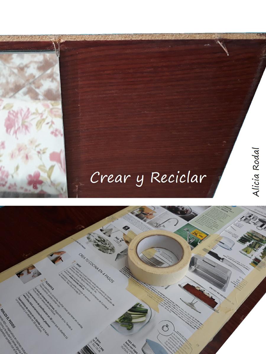 Lo primero que hacemos es quitar las grapas metálicas, lijar toda la superficie de madera y cubrir el espejo con papel periódico, revistas, folletos, catálogos viejos, etc., y cinta de carrocero por todo el borde. Esto es opcional, pero es conveniente hacerlo para no manchar el espejo.Vamos a lijar la superficie de la madera con una lija fina. Al quitar las grapas, se me hicieron unos huecos en la madera, entonces vamos a repararlo para tapar los huecos.