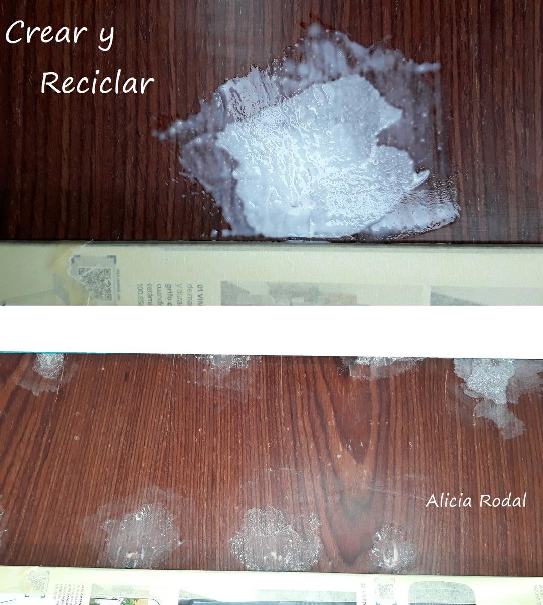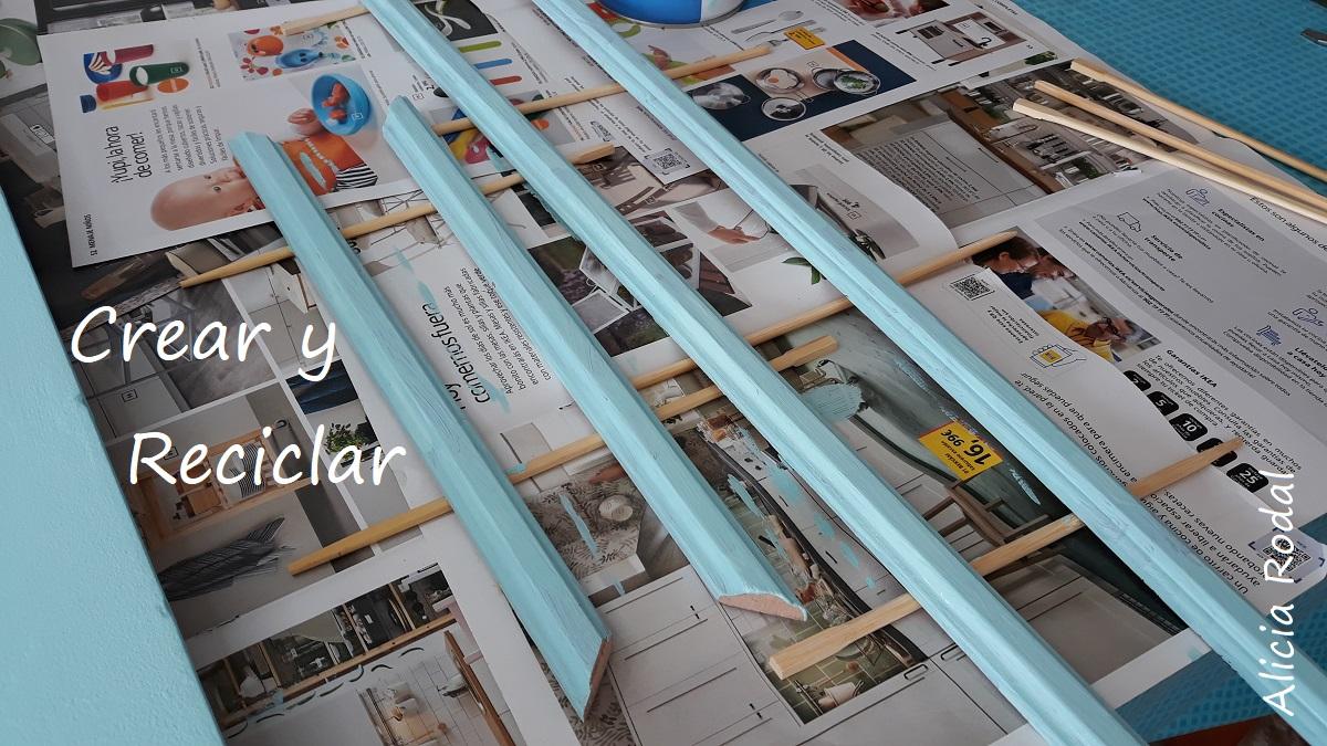 De esta forma puedes pintar los lados sin que se te quede pegada al periódico. Si te fijas en las imágenes, puedes darte cuenta que yo uso unos palos de madera, que reutilizo de los palitos de comida china.