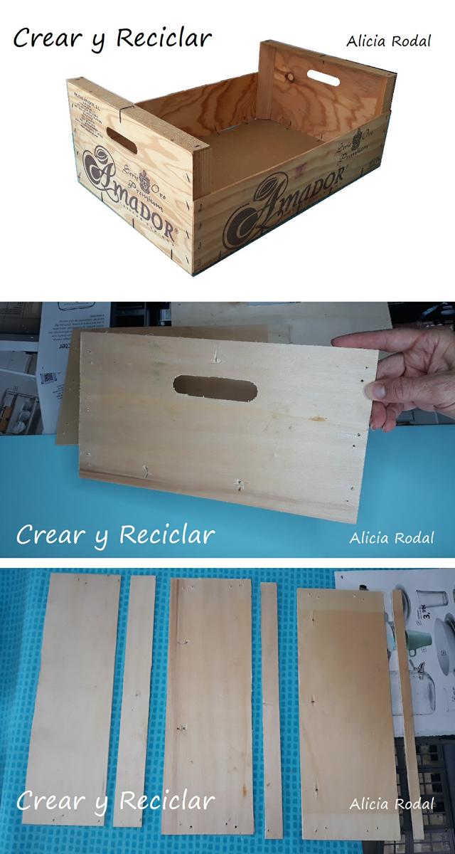 Vamos a desarmar una caja de madera o huacal, para reutilizar las tablas. Dependiendo del diseño y de la frase podemos poner 2, 3 o 4 carteles. Yo voy a poner 3 carteles, también llamados letreros, rótulos, inscripción, aviso, etc.Según el tamaño de los carteles que yo voy a hacer, necesito cortar varias piezas de madera para pegarlas y lograr el tamaño que yo quiero. Para que el cartón quede grueso, voy a poner la madera doble, así que cada cartel tendrá la madera doble.