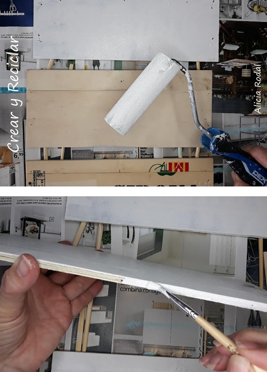 Una vez que tenemos los 3 carteles hechos los vamos a pintar. Yo usaré un rodillo y pintura de madera blanca.