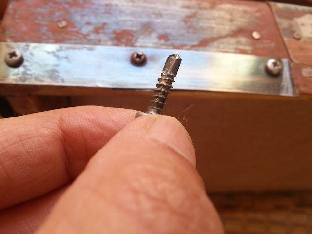 Este tornillo que os muestro es un tornillo roscachapa, es decir con su punta taladra el metal, no hace falta previamente dar un taladro.