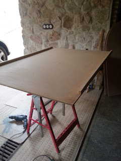 Este tablero que se ve encima del banco de trabajo, es la parte trasera de la estantería le pongo esos listones que se ven pegados y atornillados y en el fondo de la foto se ven cortados los laterales de la estantería. Que irán pegados y atornillados contra los listones que os comento.